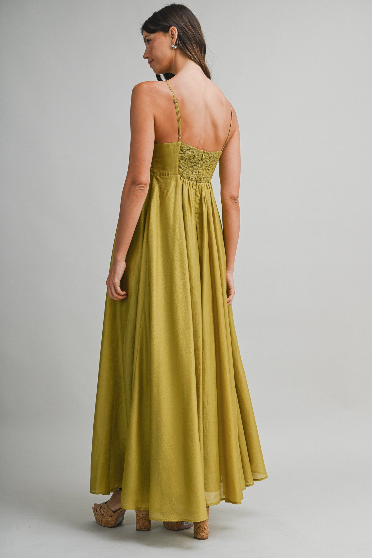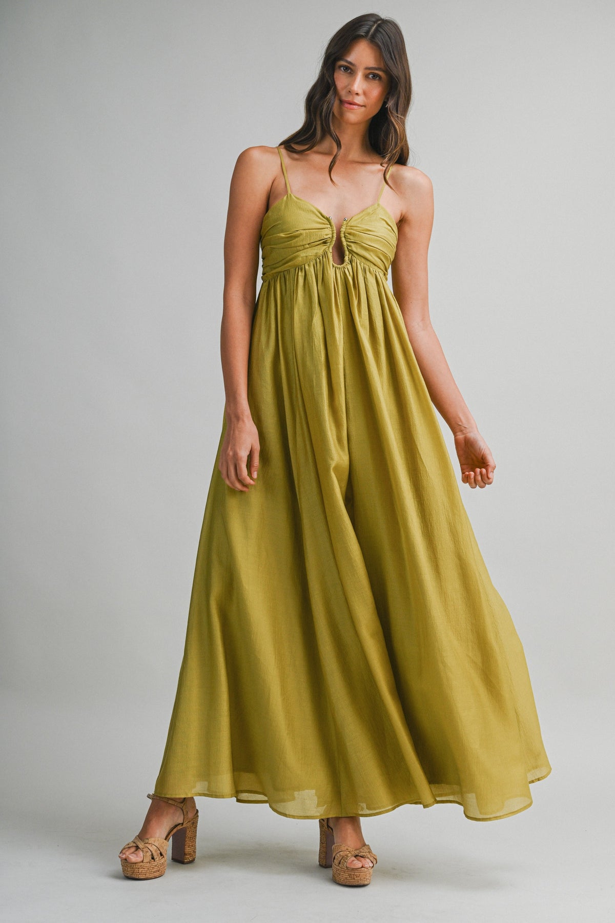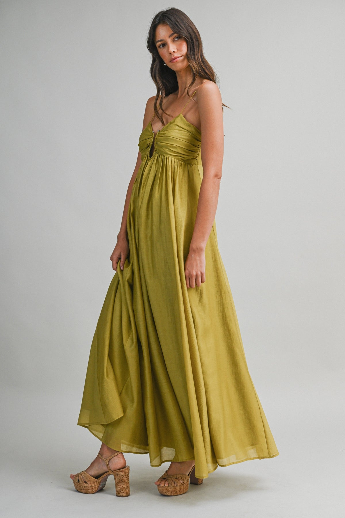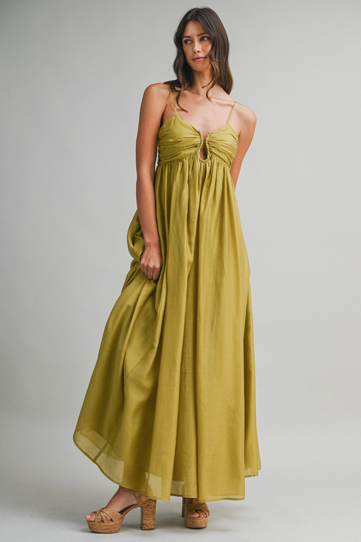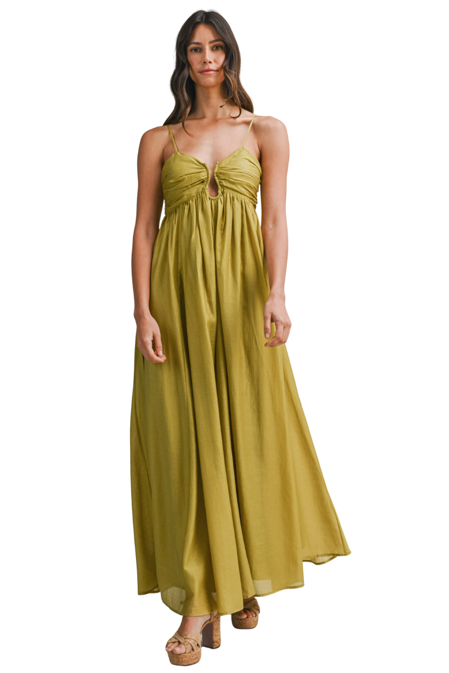 Romantic and flowy, the Kiwi Maxi Dress is made to turn heads from golden hour to moonlit dinners. This lightweight maxi features an elegant gathered bust with a front peekaboo keyhole detail, adjustable spaghetti straps, and a breezy, voluminous silhouette that moves with you. The rich kiwi tone makes it a timeless yet unique piece you’ll reach for all summer long. Dress it up with heels for your next vacation dinner or keep it casual with sandals and gold jewelry.