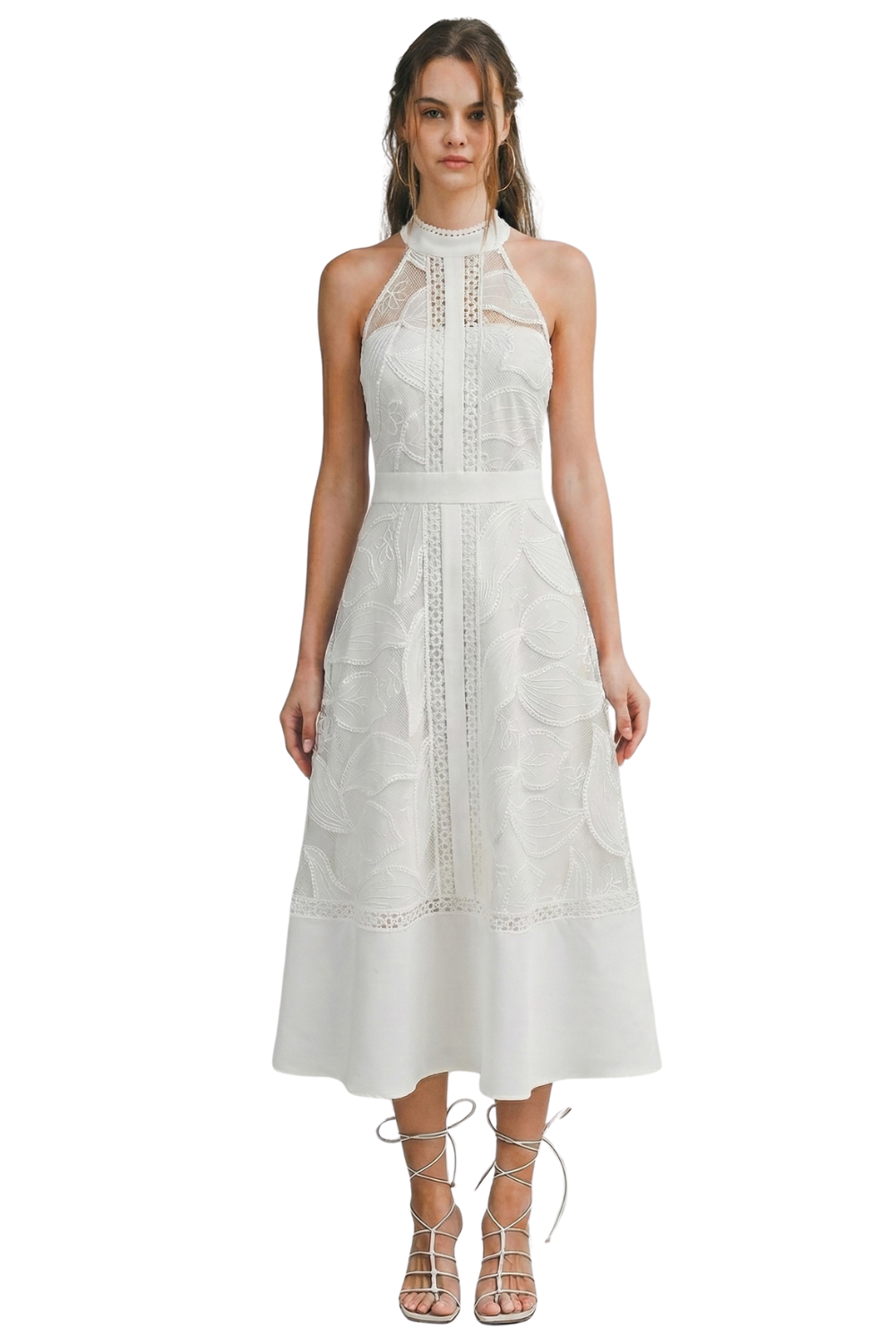 The Étoile Lace Halter Midi Dress is timeless elegance with a modern, feminine edge. Designed with an intricate lace overlay and delicate sheer detailing, this halter-neck midi dress features a flattering fitted waist and a softly flowing skirt that moves beautifully with every step. The high neckline and subtle lace paneling add an elevated, romantic feel, making it perfect for bridal events, summer soirées, garden parties, or special occasions.