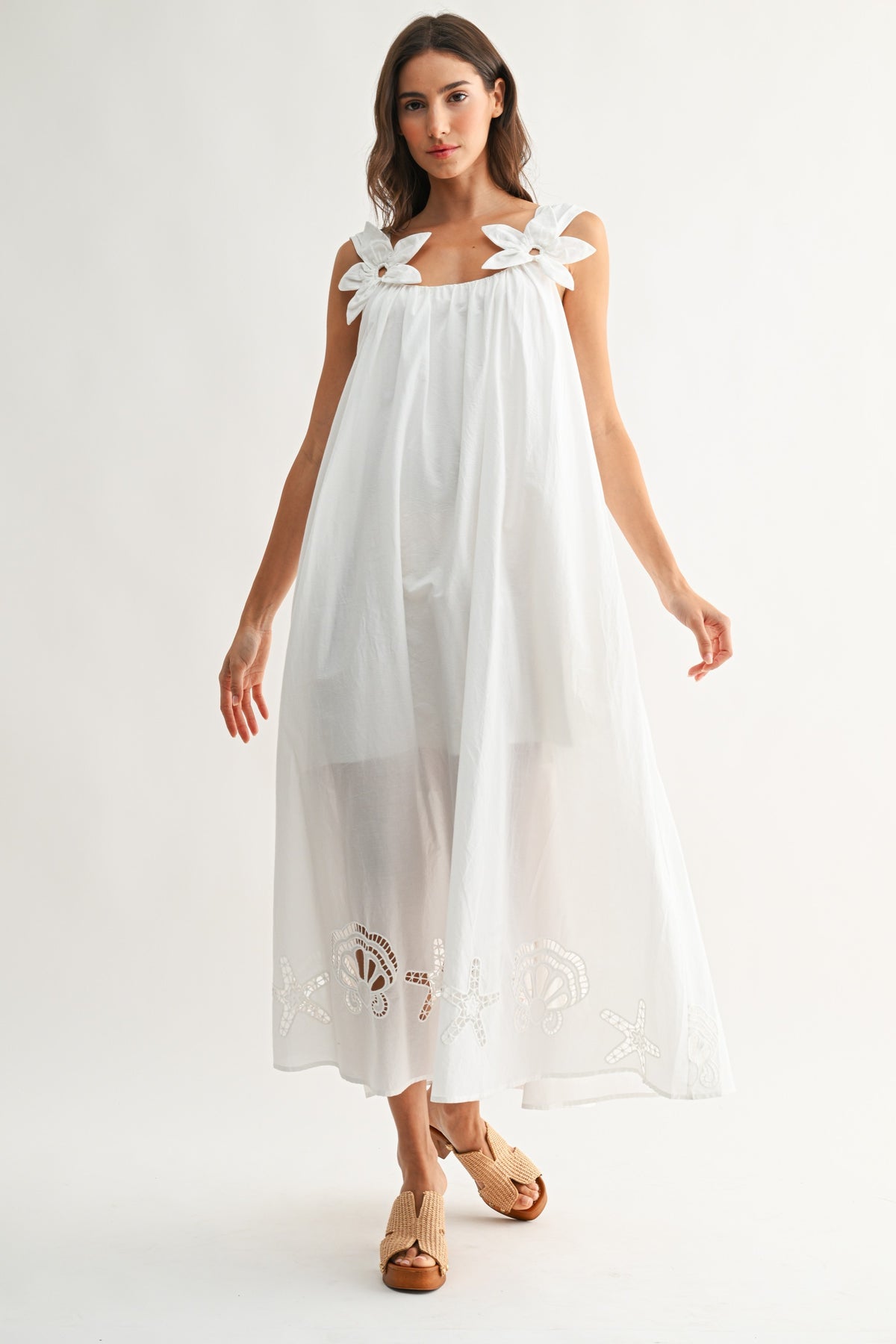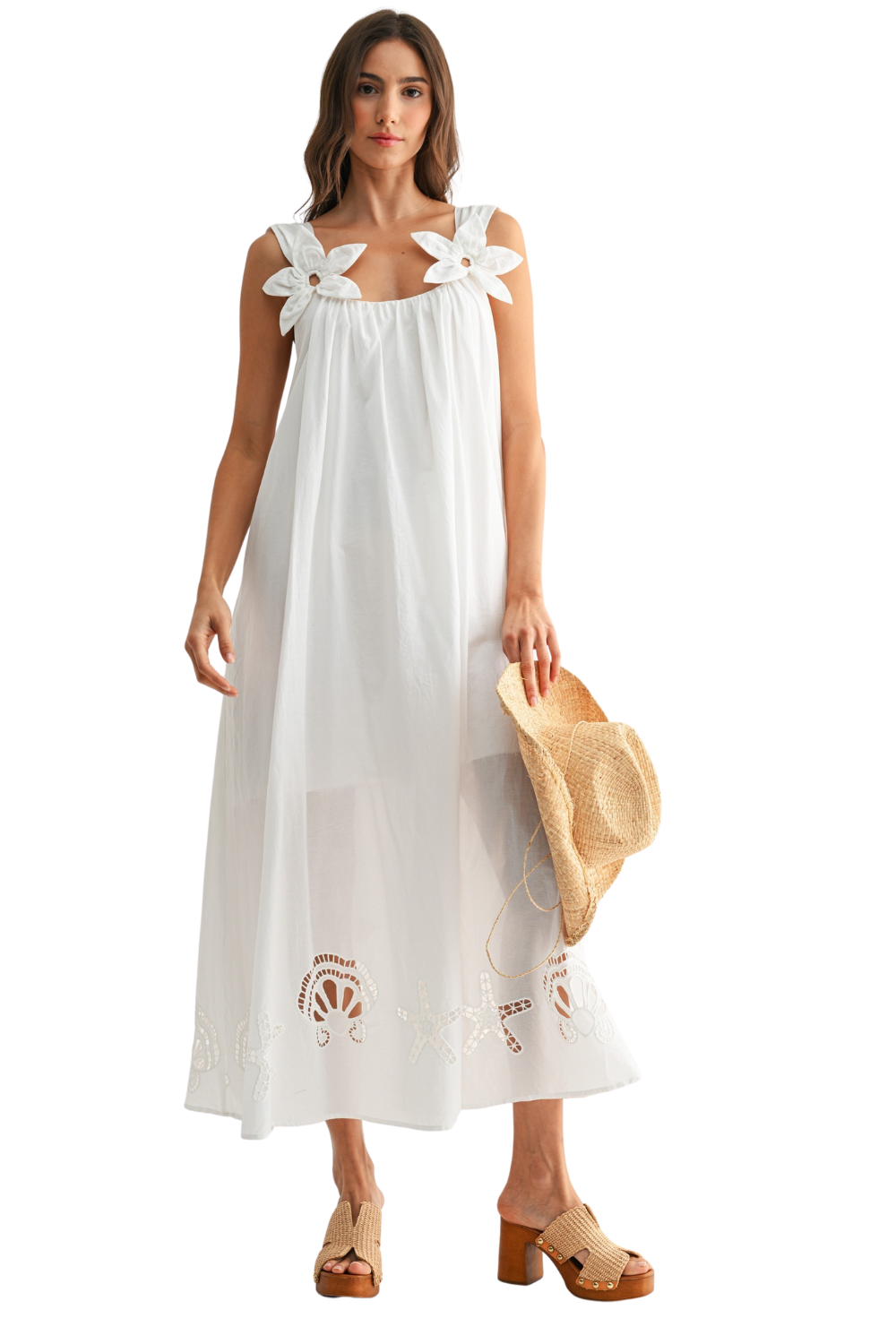 The Sea Breeze Midi is your dream summer dress—light, airy, and effortlessly elegant. Designed in crisp white cotton, it features oversized floral straps with eyelet details and delicate embroidery along the hemline with sea-inspired motifs like shells and starfish. The relaxed silhouette flows gracefully, making it perfect for warm beach days, resort strolls, or Sunday brunch al fresco. Pair it with woven sandals and a straw hat for the full island-girl aesthetic.