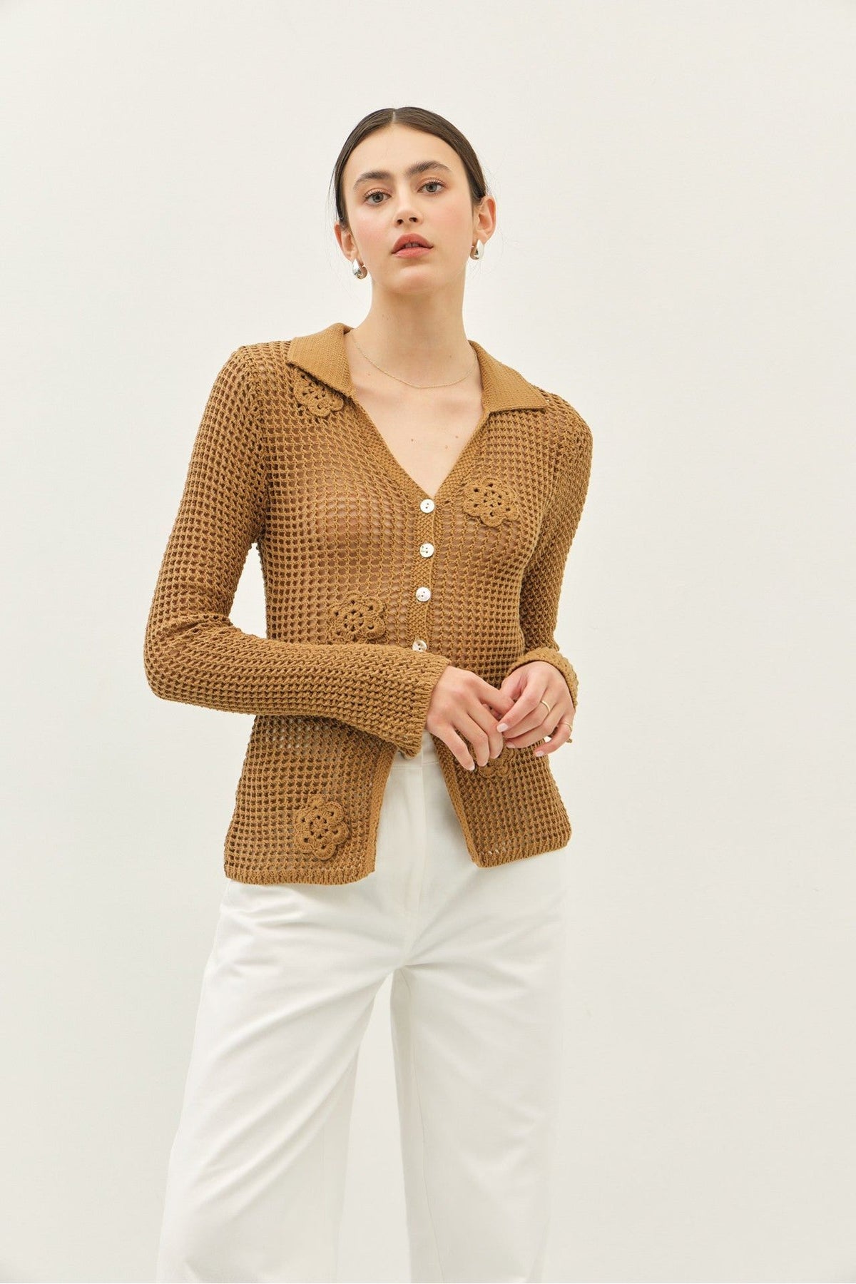 The Honeycomb Bloom Cardigan is a vintage dream with a modern twist. This lightweight, open-knit button-up top features dainty crochet flower appliqués, a flattering V-neckline, and a chic collar for that perfect touch of retro charm. Its warm honey-brown tone pairs effortlessly with denim, white trousers, or layered over a bralette for a cozy-yet-cool look.