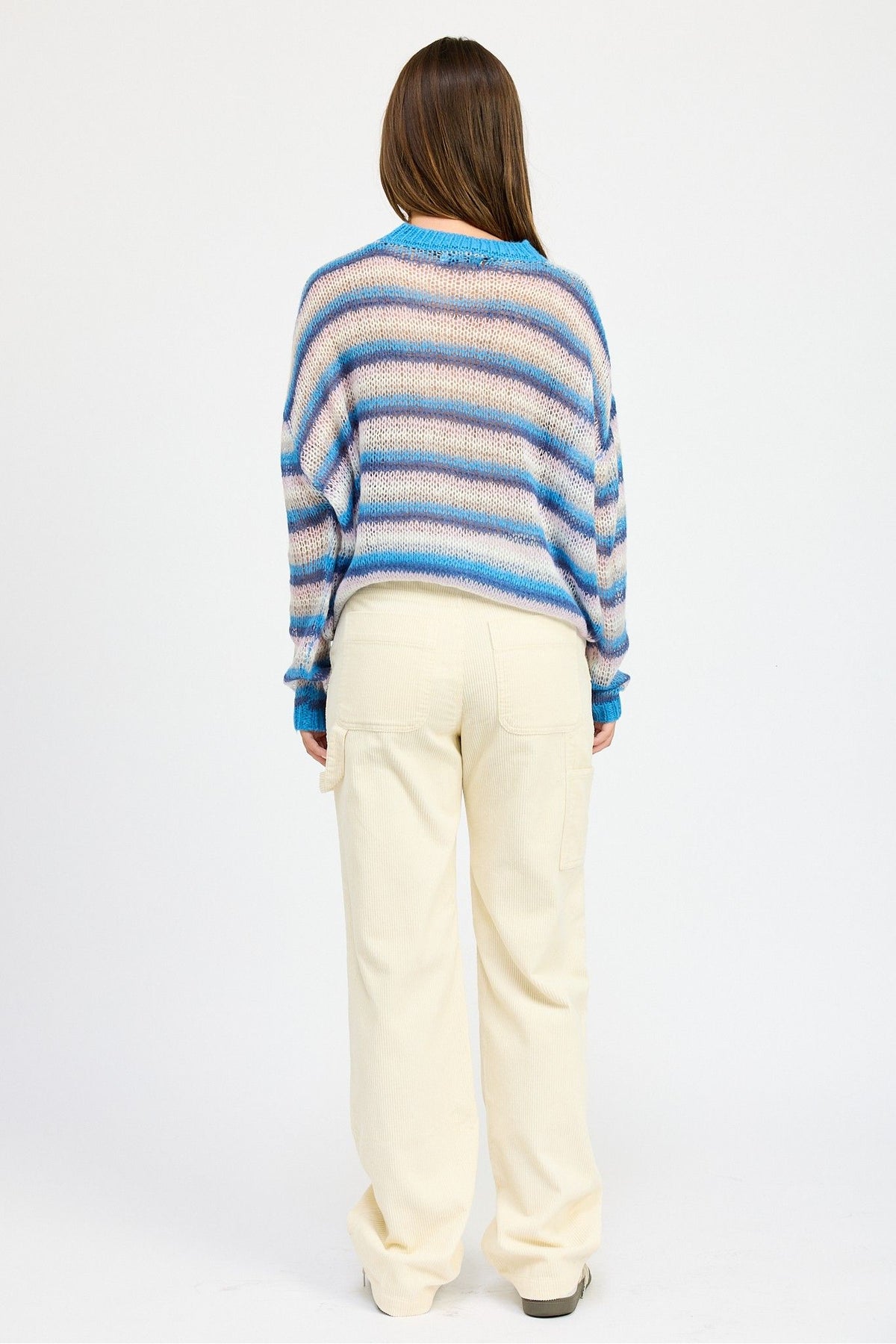 Step into cozy-cool vibes with the Blueberry Swirl Knit Sweater. This ultra-soft piece features a dreamy swirl of pastel blue, lavender, and cream hues in a relaxed knit with a pop of bright turquoise at the collar and cuffs. Designed with a comfy, slightly oversized fit, it's the perfect sweater to throw on for those chill days when you still want to look put-together. Pair it with your favorite cargos or denim for a colorful twist on a laid-back look.