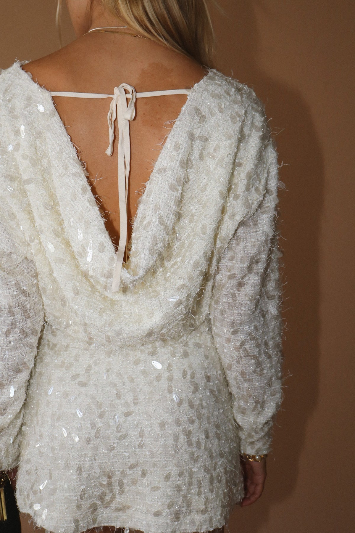 Bring the sparkle to every soirée with The Serena Set — a statement-making combo designed to turn heads. The soft ivory tweed is infused with subtle sequins that shimmer under the light, giving you that effortlessly glam glow. The long-sleeve top has a relaxed fit that pairs perfectly with the matching mini skirt, creating a timeless, yet modern party look.