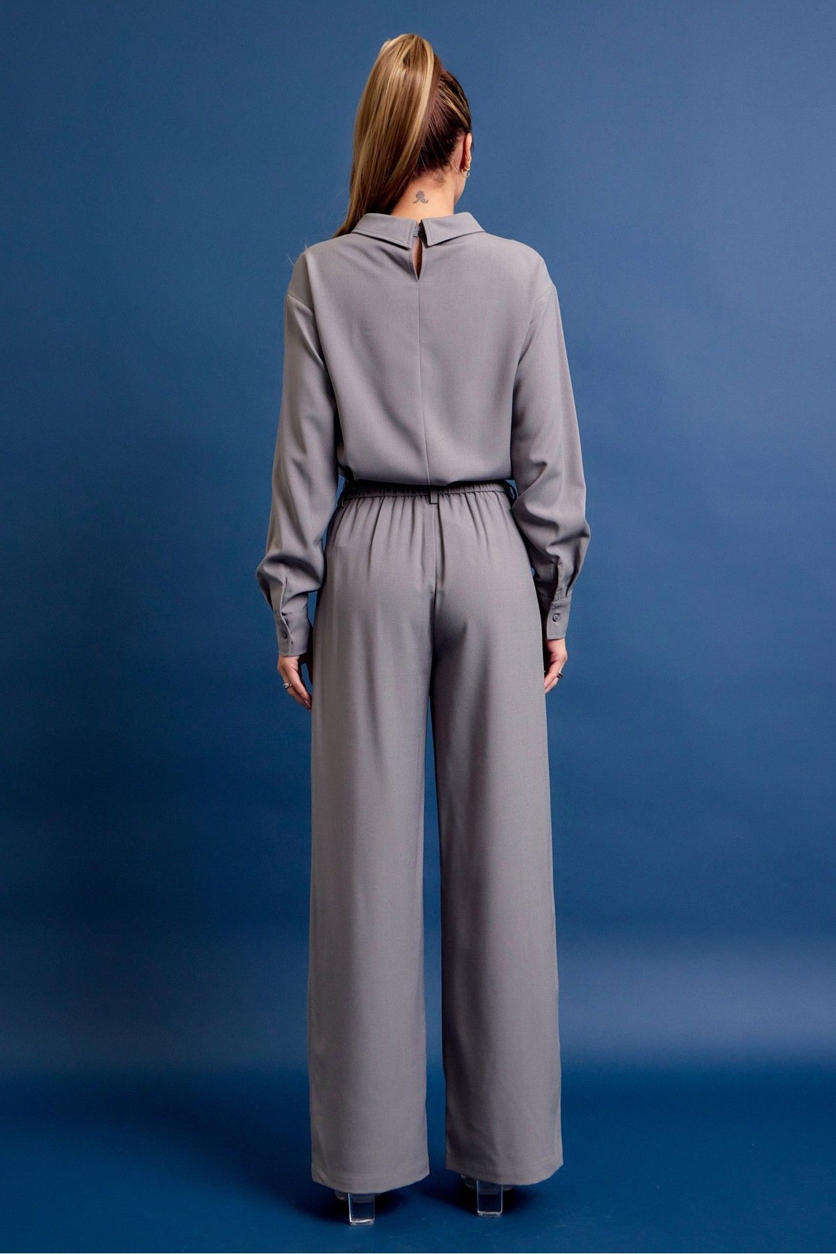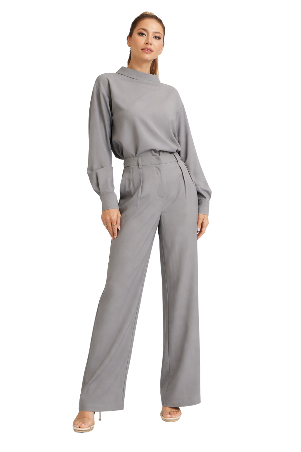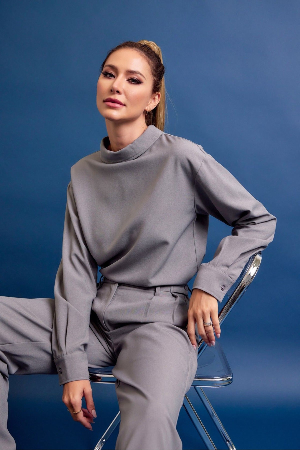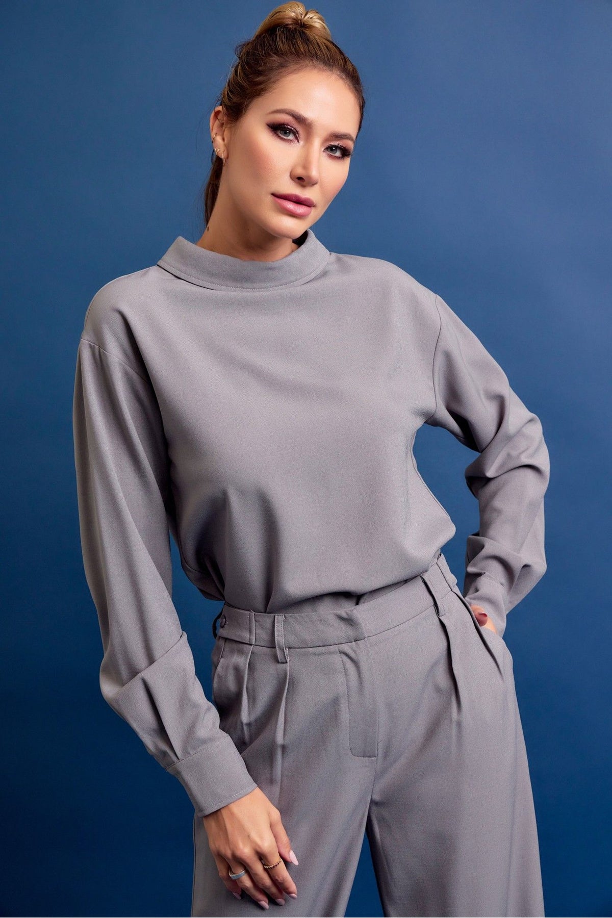The Slate Tailored Set is the definition of effortless sophistication. Designed with a relaxed mock-neck blouse and matching high-waisted wide-leg trousers, this set delivers a clean, elevated look with a modern edge. The fluid fabric drapes beautifully, offering both structure and movement, making it perfect for workwear, events, or an elevated everyday outfit. Wear it together for a sleek monochrome moment or style each piece separately for endless versatility.