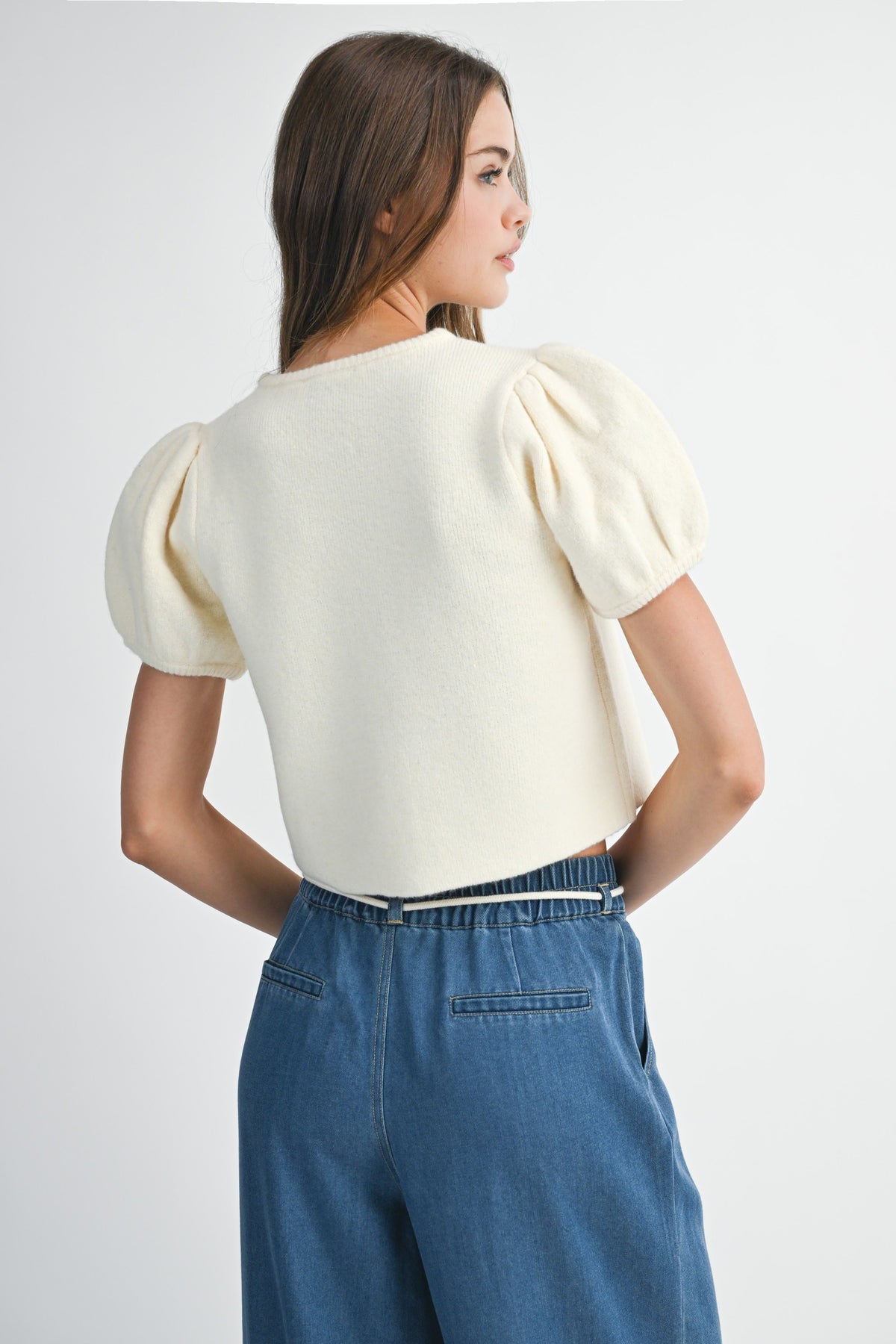 Soft, structured, and effortlessly chic—the Marbella Puff Sleeve Knit Top brings timeless charm to your wardrobe. Featuring statement puff sleeves, a boxy cropped silhouette, and dainty front buttons, this piece pairs perfectly with high-rise denim or a tailored skirt. Made from a cozy knit that feels elevated but wearable year-round.