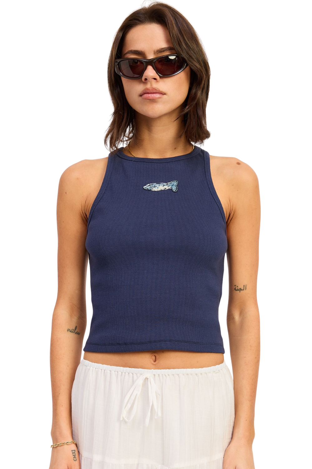 Catch coastal vibes in the Bluefin Tank, a ribbed navy blue top that’s equal parts comfy and cool. Featuring a playful beaded fish motif at the chest, this fitted high-neck crop adds the perfect splash of character to your summer rotation. Pair it with breezy linen pants, your favorite swimwear, or denim cutoffs—this tank was made for slow beach days and sunny city strolls alike.