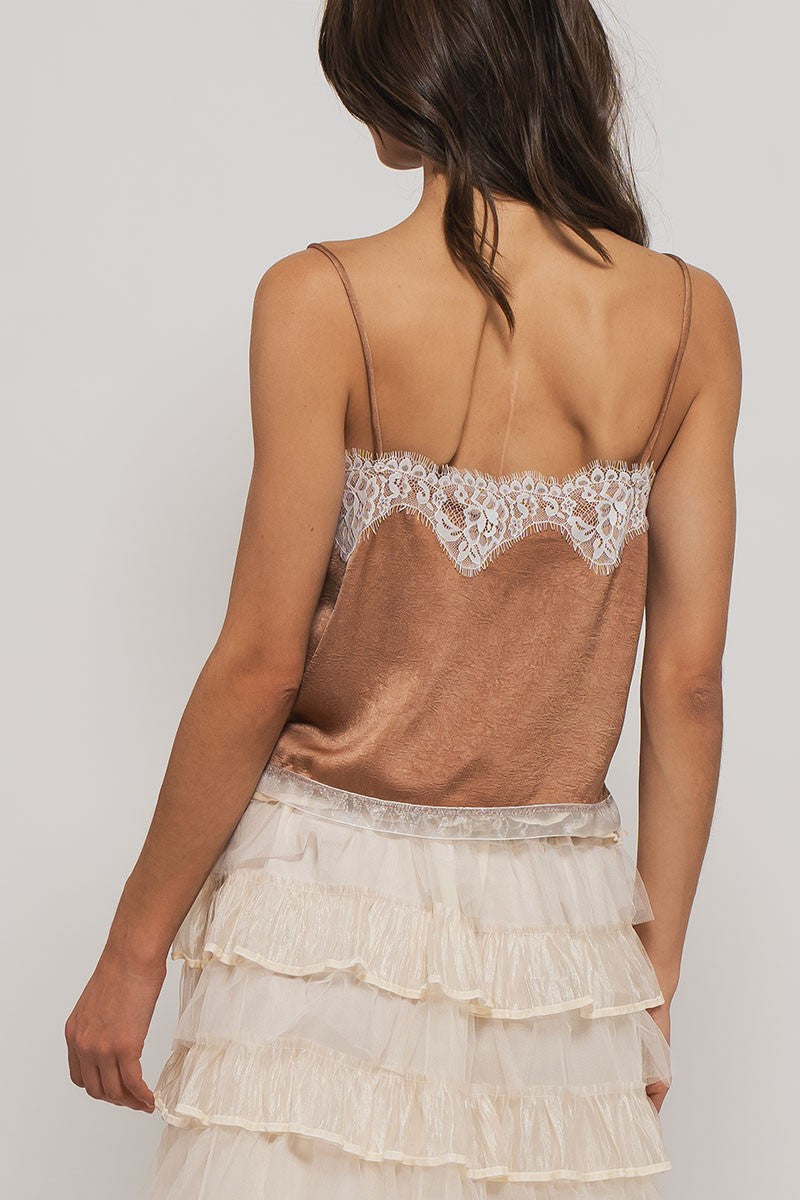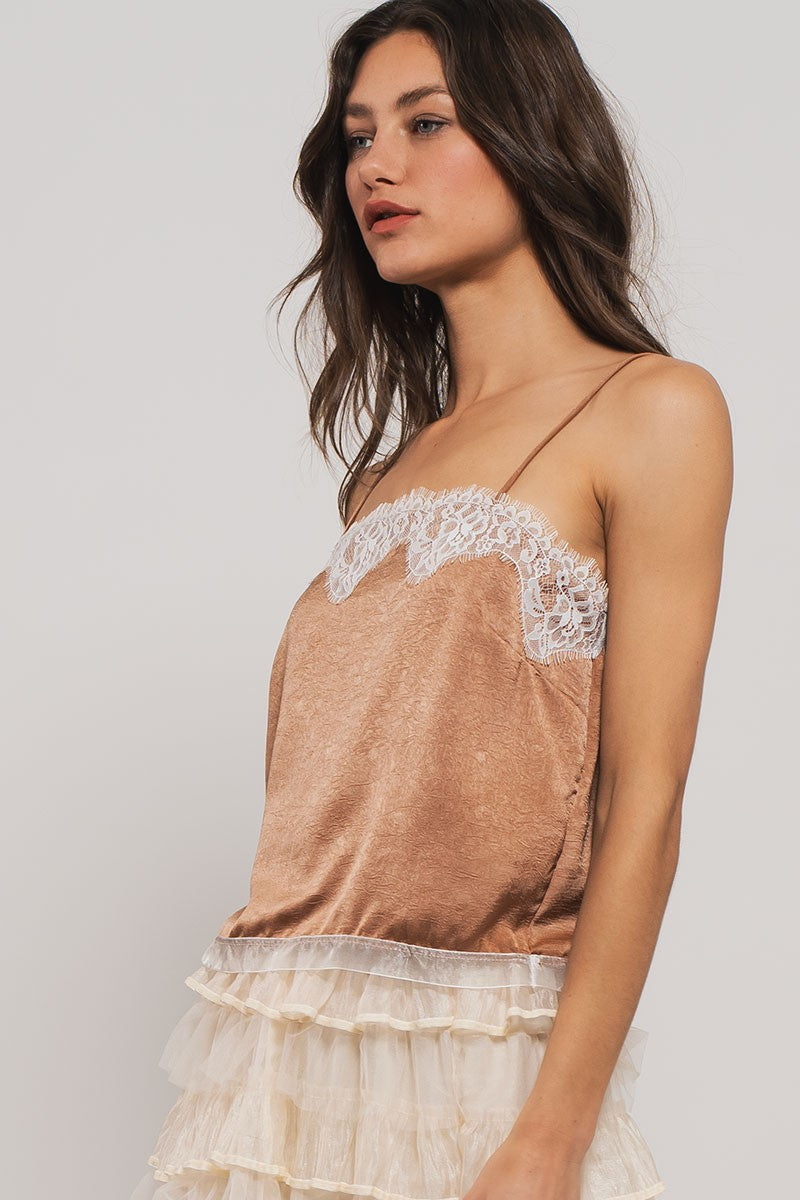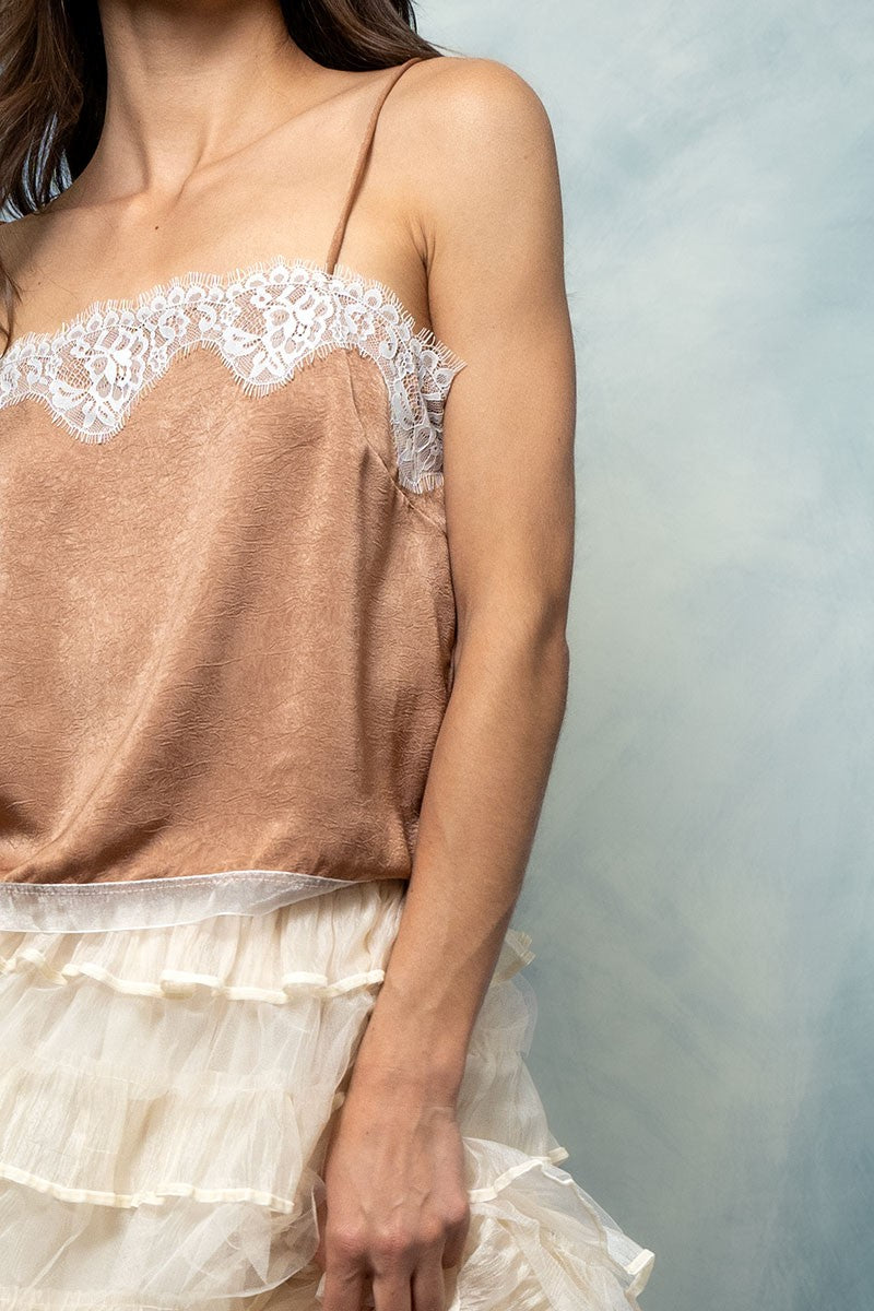 Slip into romantic elegance with the Hash Lace-Trim Cami — a soft satin-like top in a rich mocha hue, elevated with delicate white scalloped lace detailing along the neckline and hem. With a flattering relaxed fit and adjustable spaghetti straps, this piece blends vintage-inspired charm with modern ease. Perfect for layering under blazers or pairing with flirty skirts for a feminine touch.