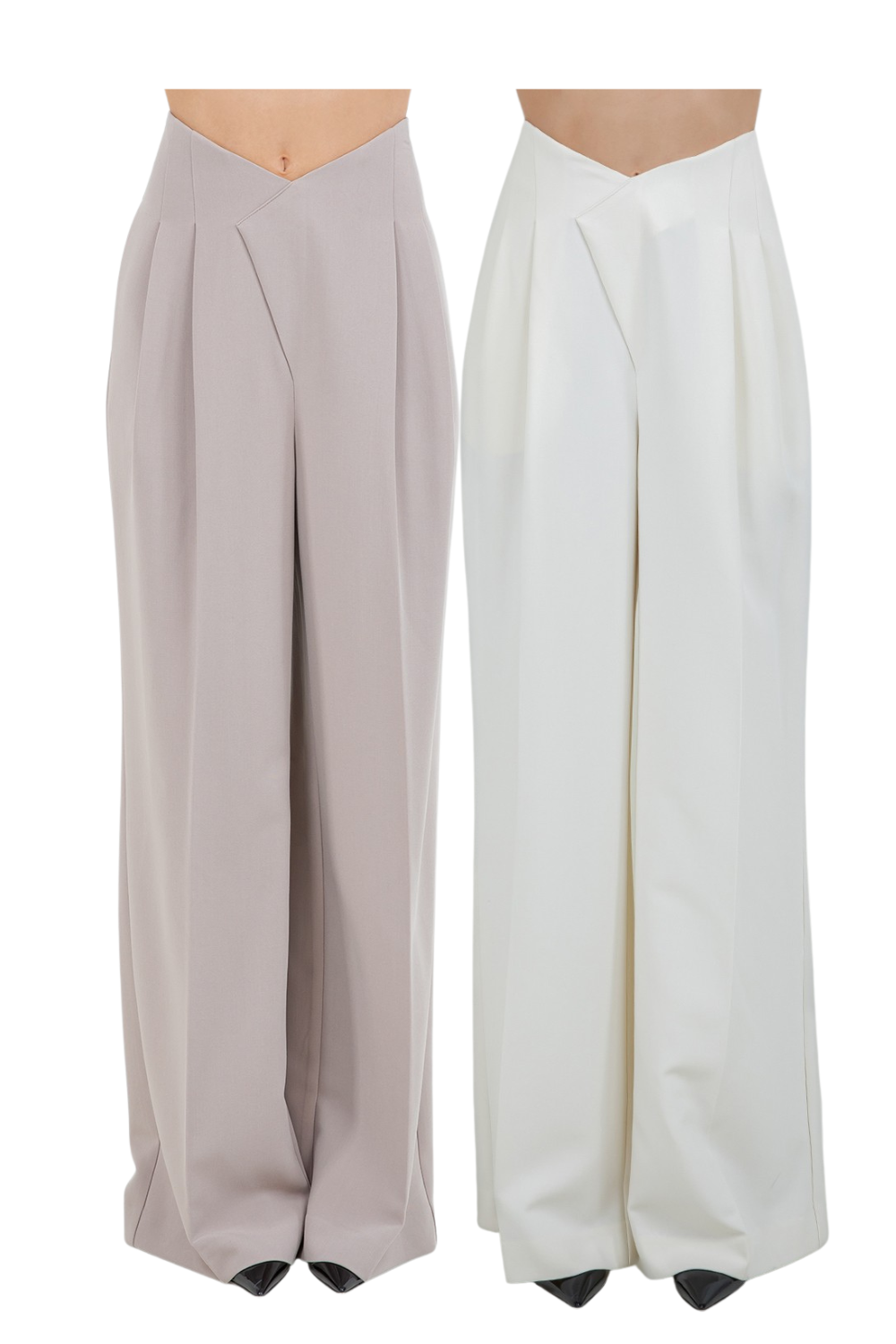 Elegance meets edge with these trousers – a wide-leg silhouette crafted in structured ivory fabric with a tailored pleat and asymmetric waistband. These pants bring effortless polish to any outfit, pairing beautifully with minimalist tops or bold evening pieces. Sophisticated, flattering, and versatile — they're a modern staple.