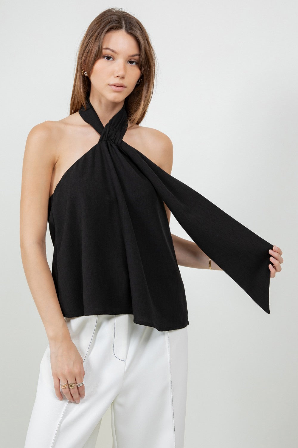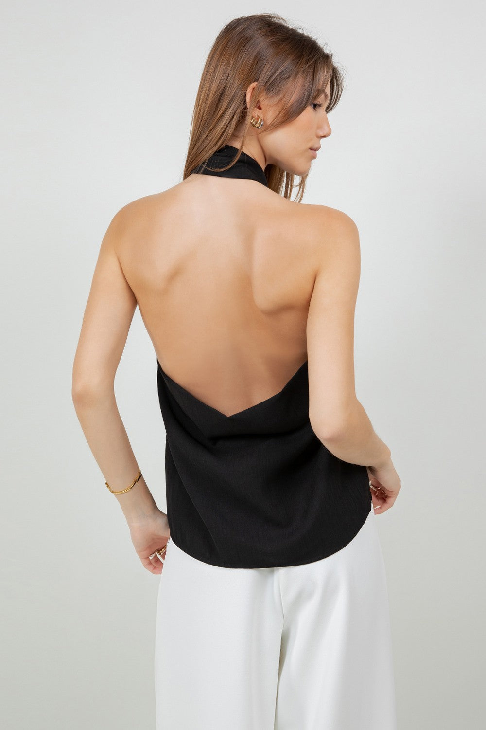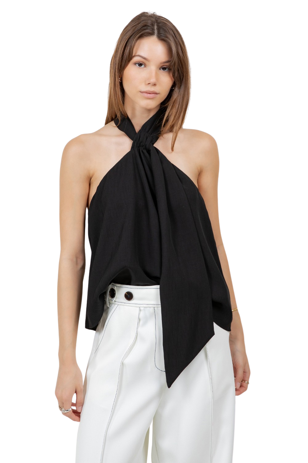 Minimal, sensual, and effortlessly elegant — this black halter top is the kind of piece that needs nothing else to make a statement. A twisted gathered knot at the neckline anchors two fluid panels of fabric that drape across the chest in a relaxed, scarf-like silhouette, while the back reveals a dramatic fully open cowl that dips beautifully low. The asymmetric pointed hem adds one final unexpected detail that elevates this top from simple to sculptural.
