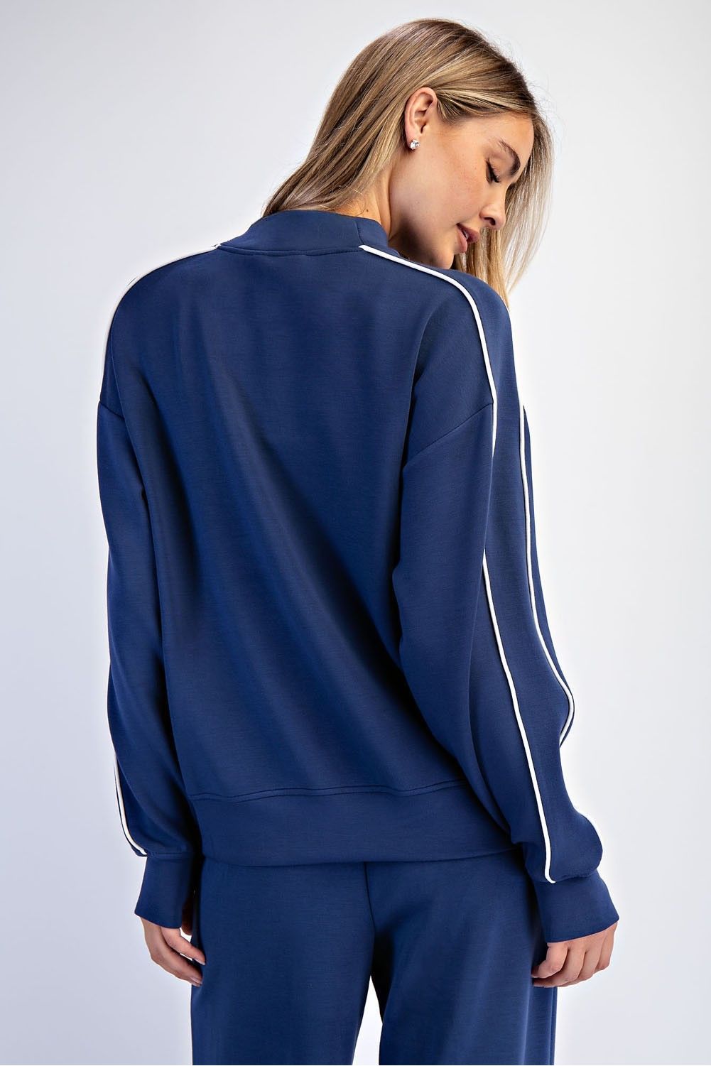 Cool, classic, and made for movement. Our Marseille Lounge Set brings a sleek twist to comfort with its structured silhouette and clean contrast piping. Designed in a rich navy tone, this set features a relaxed crewneck top with fluid, wide-leg pants that elevate your off-duty look. Whether you're lounging at home or running errands in style, this is your new go-to for effortless chic.