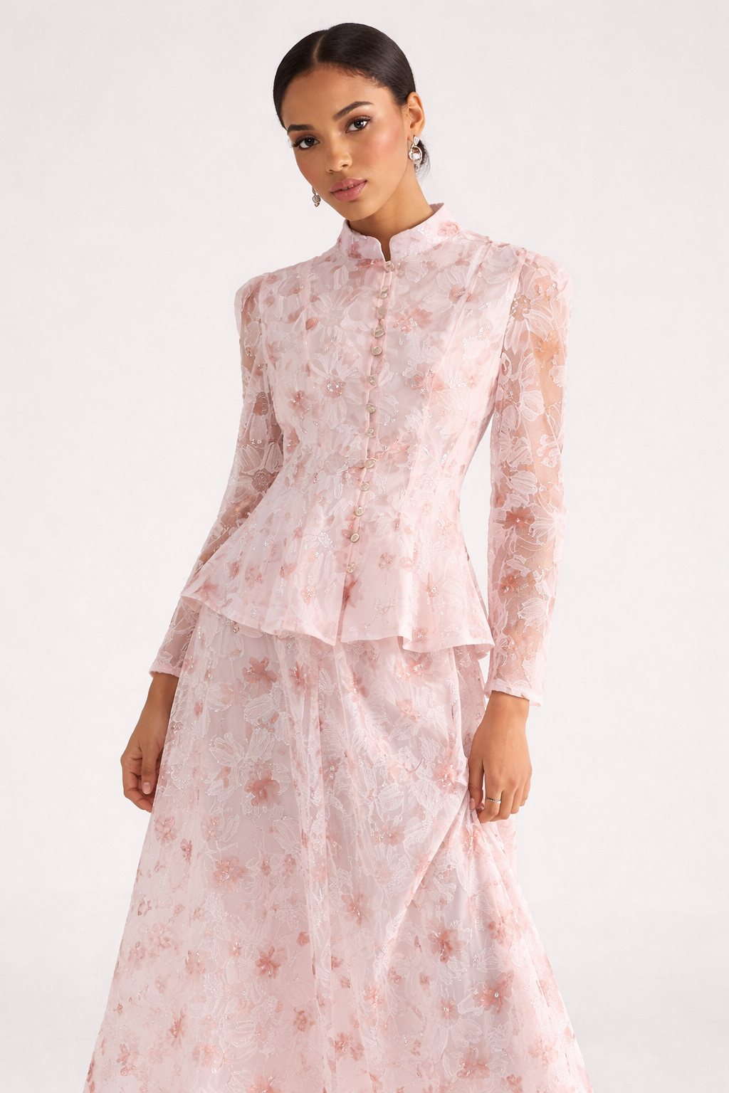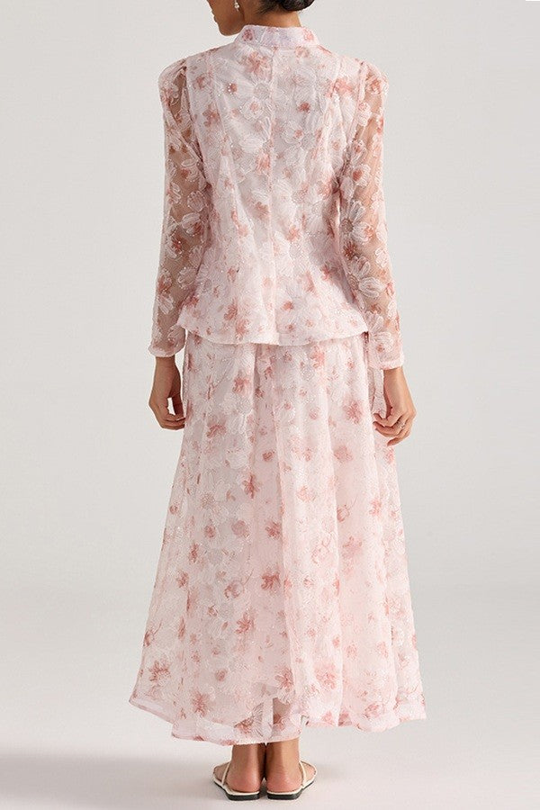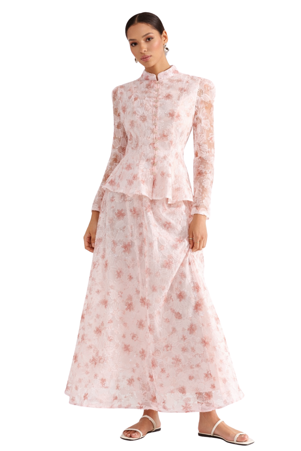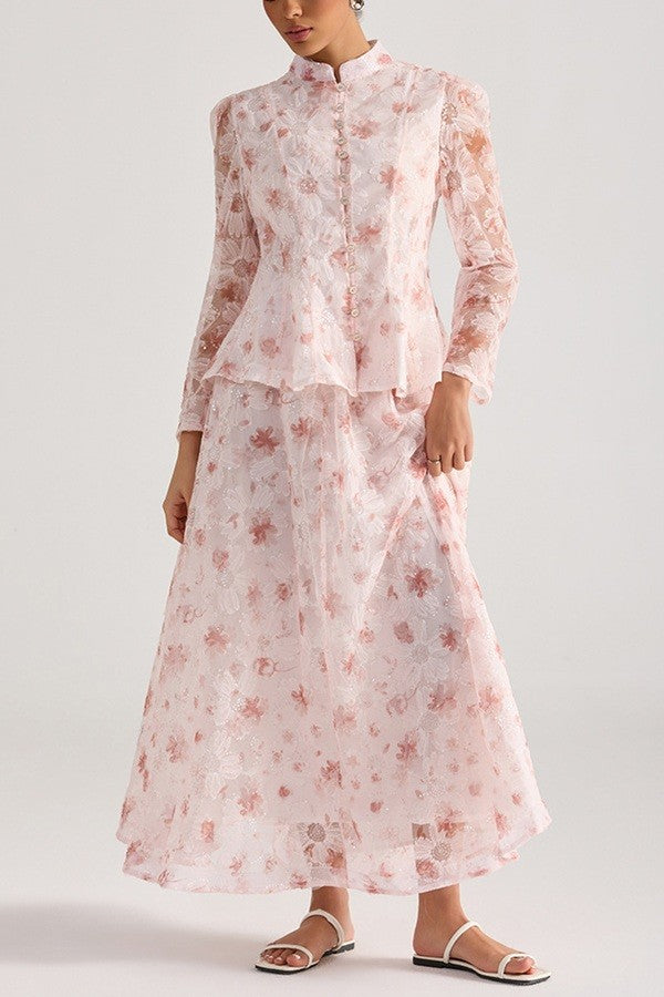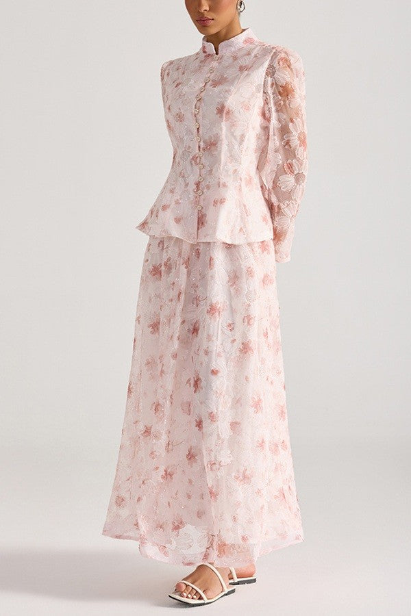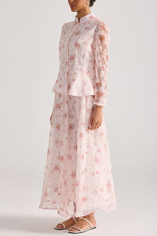 Soft, romantic, and effortlessly elevated — the Petal Whisper Lace Set is the definition of feminine elegance. Designed in a delicate sheer lace with subtle floral detailing, this two-piece set features a structured, button-down peplum top paired with a flowing maxi skirt for a graceful, elongating silhouette.