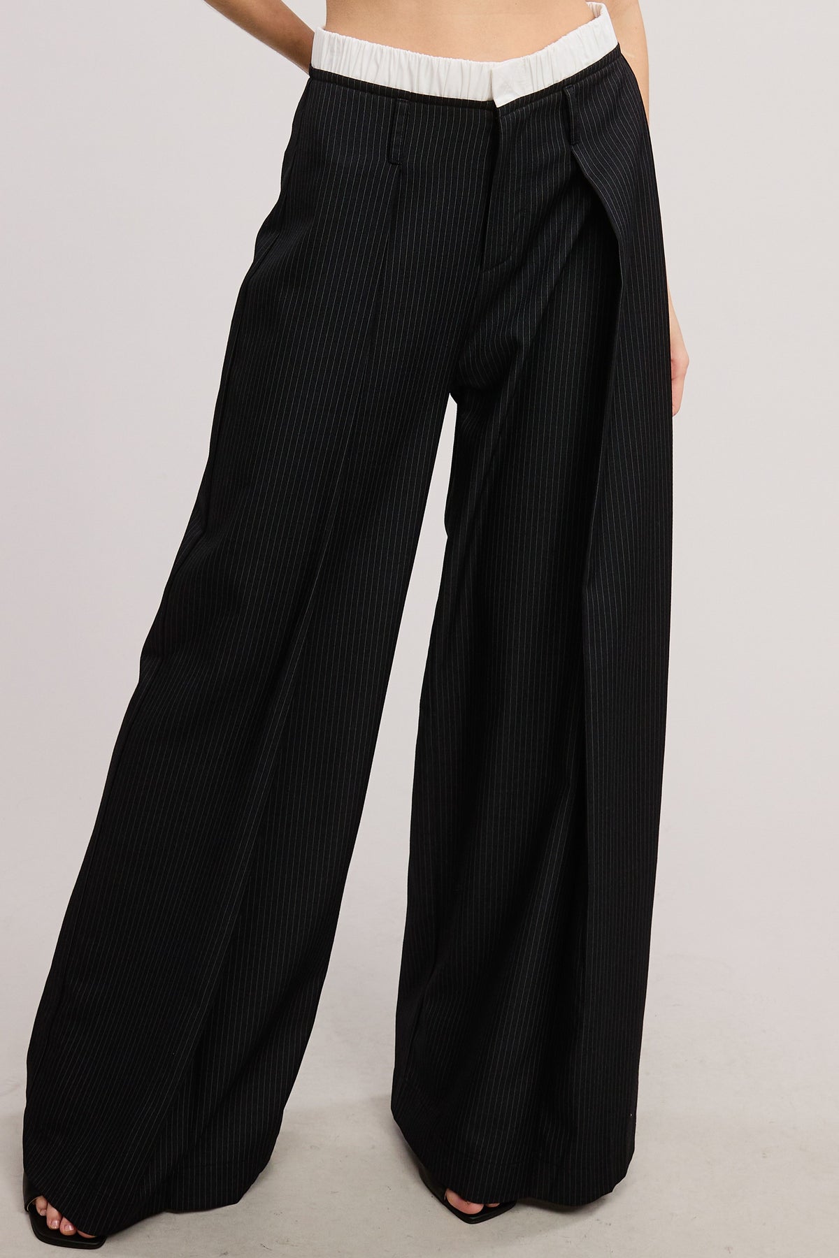 Tailored meets edgy cool. The Pinstripe Wide-Leg Trousers feature a sleek, high-rise silhouette with subtle pinstripes and a unique layered waistband detail that gives them a deconstructed-chic vibe. The wide-leg cut flows effortlessly, adding movement and elongating the legs while keeping the look modern and polished.