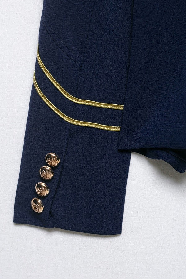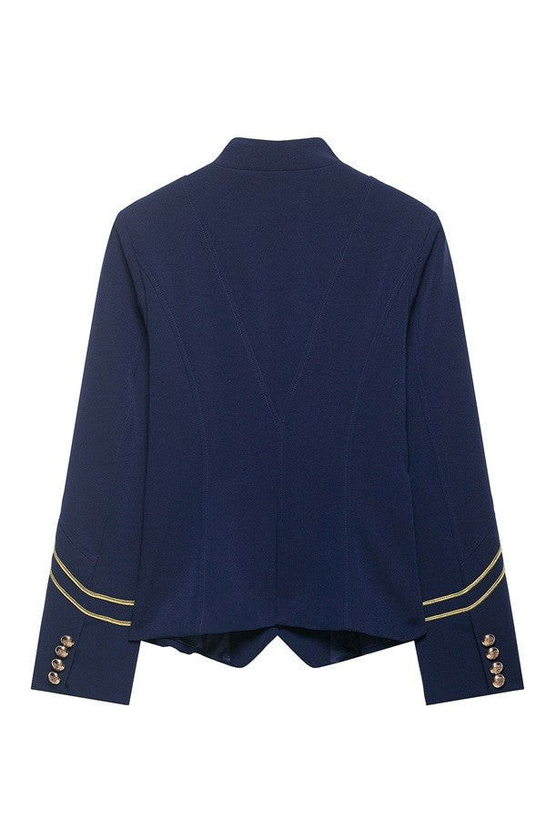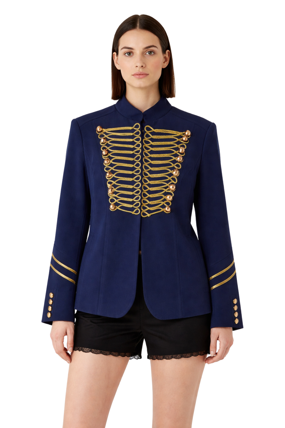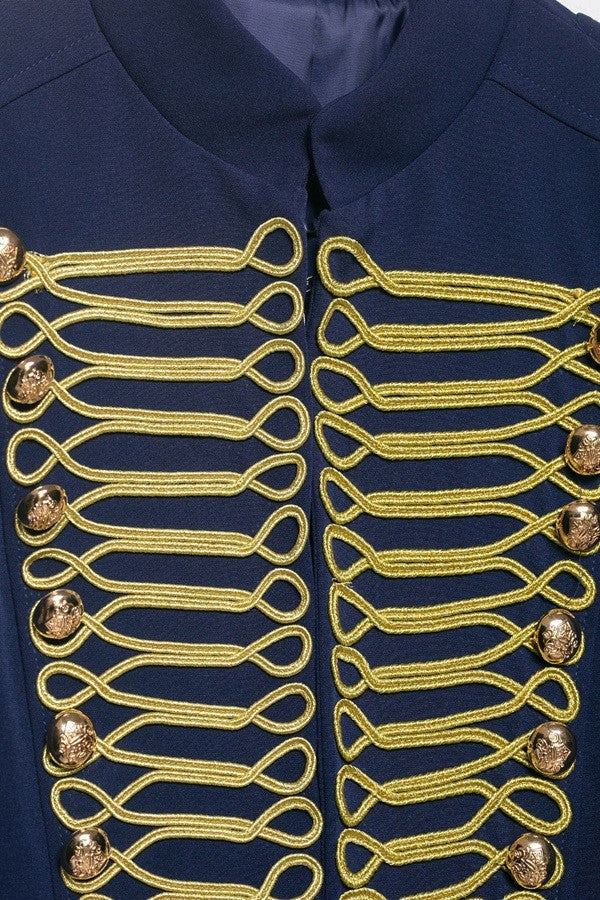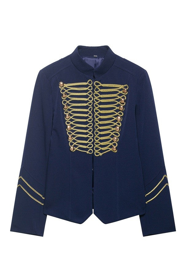 Crafted in a deep navy tone, this jacket features intricate gold braided detailing across the front, finished with embossed gold buttons for a bold, elevated touch. The high neckline and clean tailoring create a sharp silhouette, while the slightly looser waist fit keeps it modern and effortless.