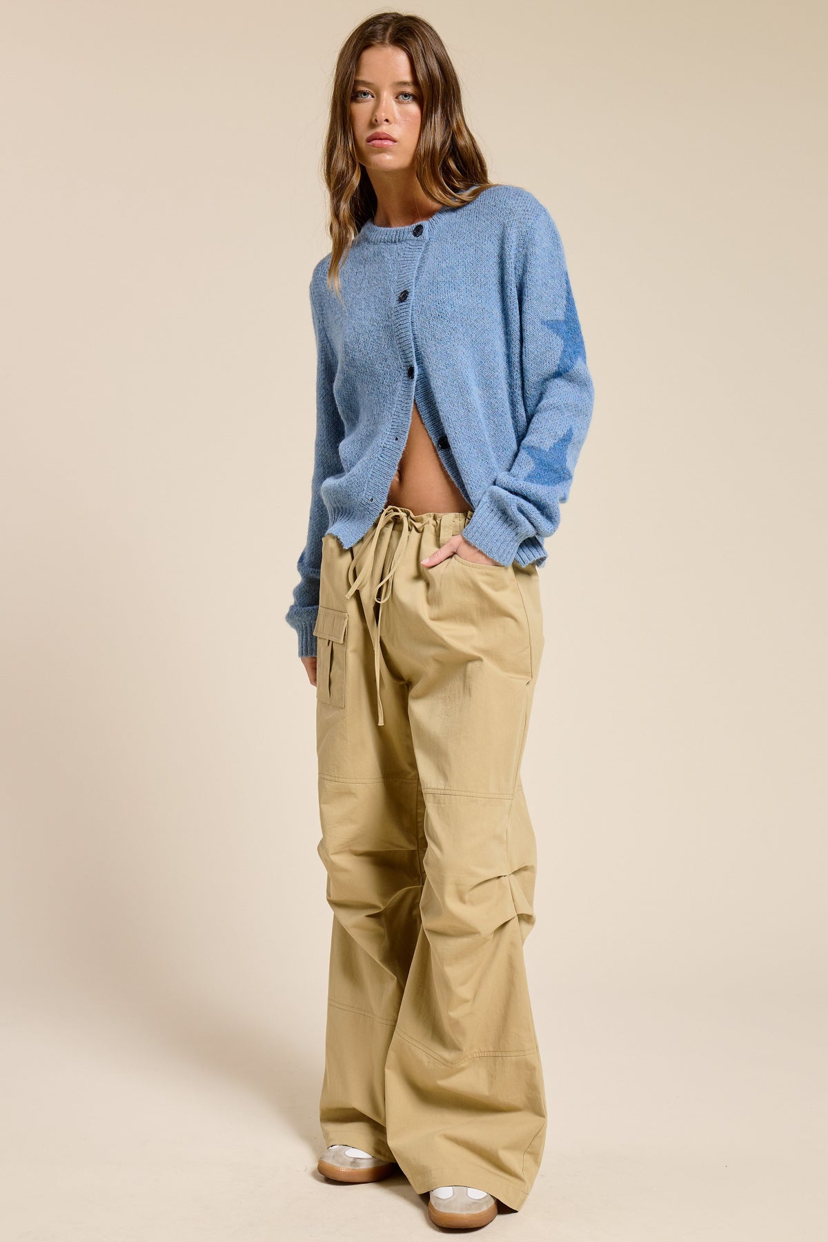 A dreamy upgrade to your casual layers. The Starry Sky Knit Cardigan is crafted from a soft, cozy knit in a calming periwinkle blue and features subtle star details on the sleeves for a hint of playful edge. With its slightly cropped hem and easy button-up front, this cardigan is perfect for throwing over basics or pairing with cargos for a cool-girl look that still feels warm and soft.