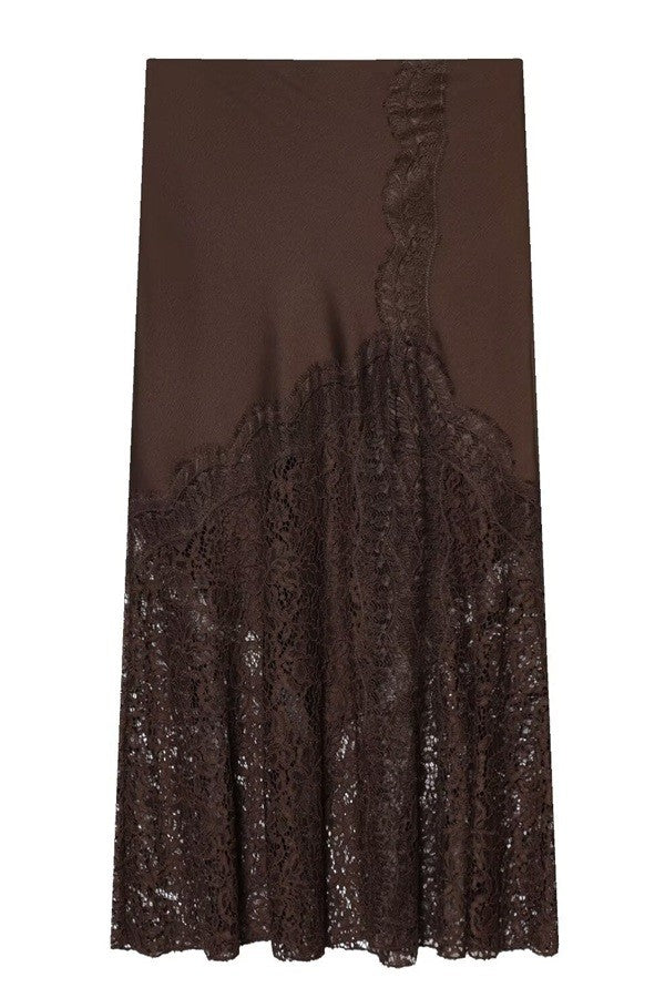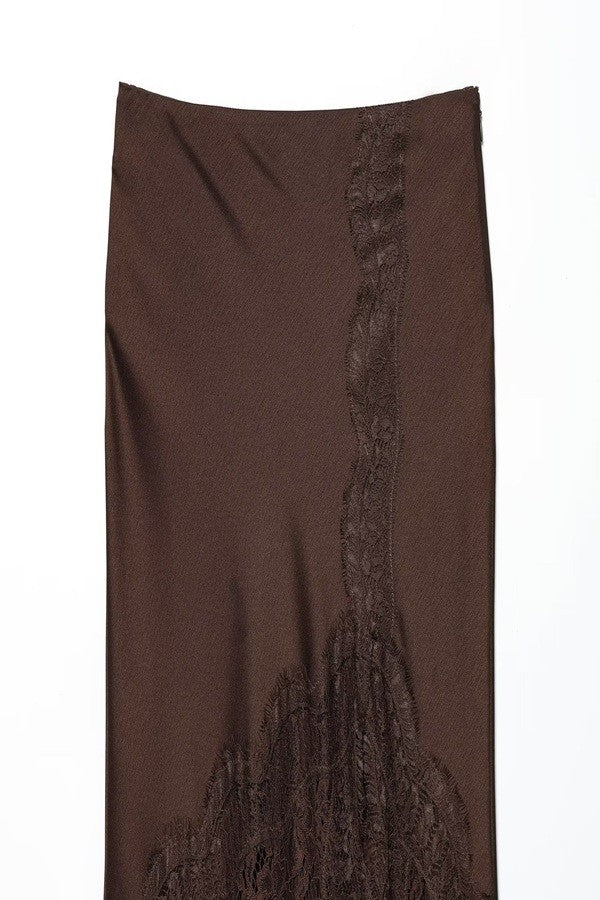 Soft, sleek, and undeniably chic. The Espresso Midi Skirt is made from silky satin and finished with a sheer lace trim that adds subtle drama and texture. The flattering high-waist fit and side zipper closure create a clean silhouette, while the lace hem offers just the right amount of allure. An easy statement piece you’ll reach for season after season.
