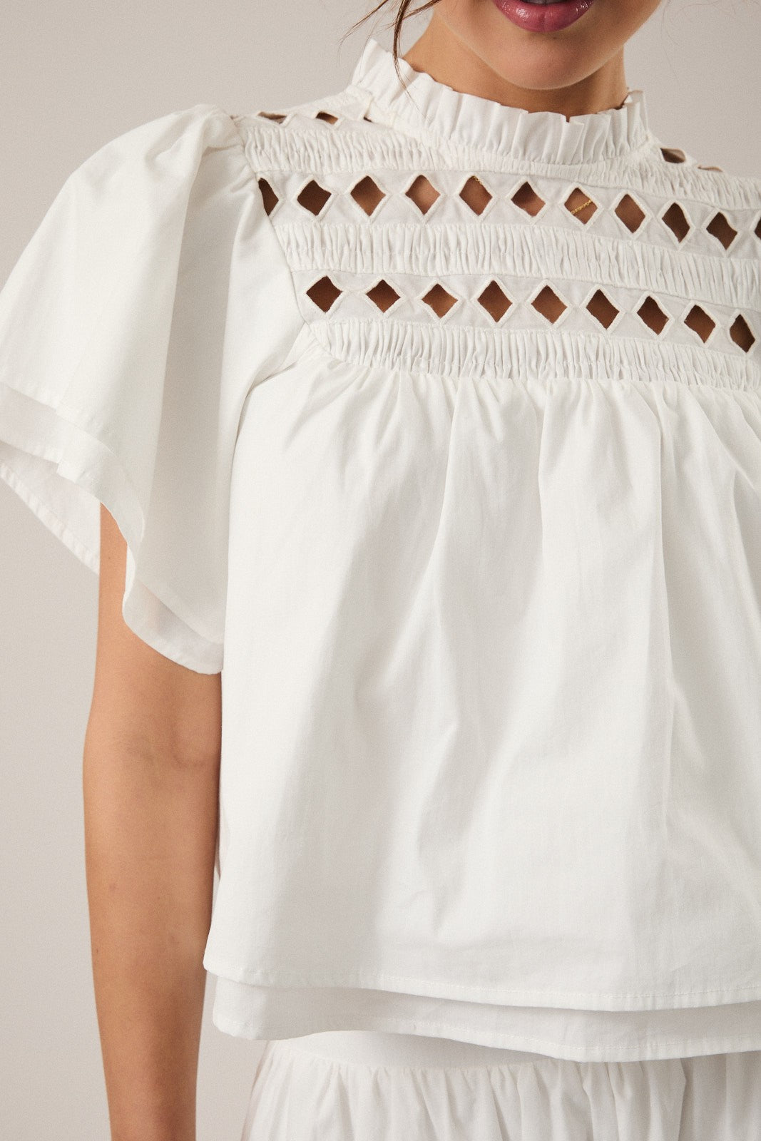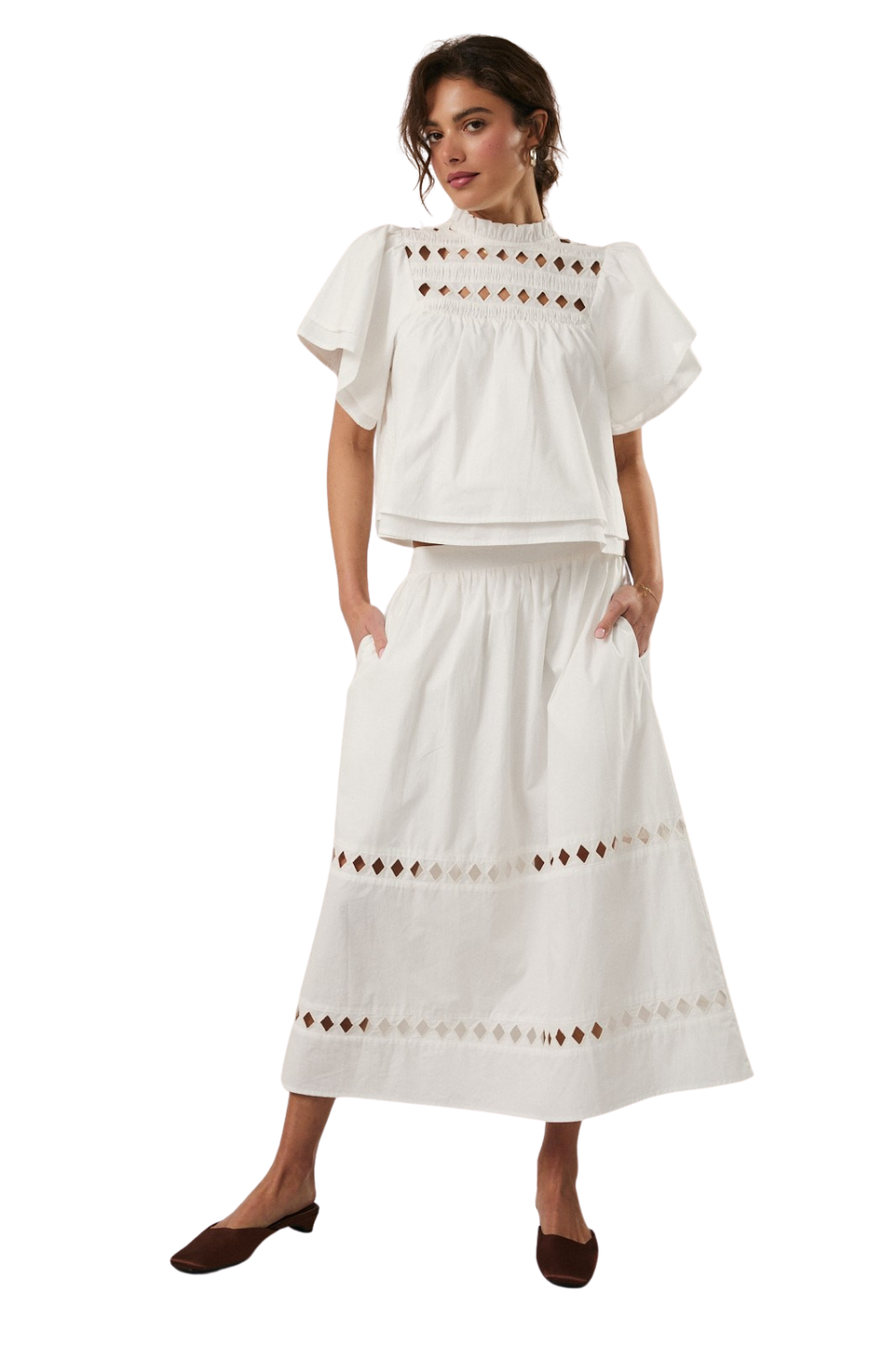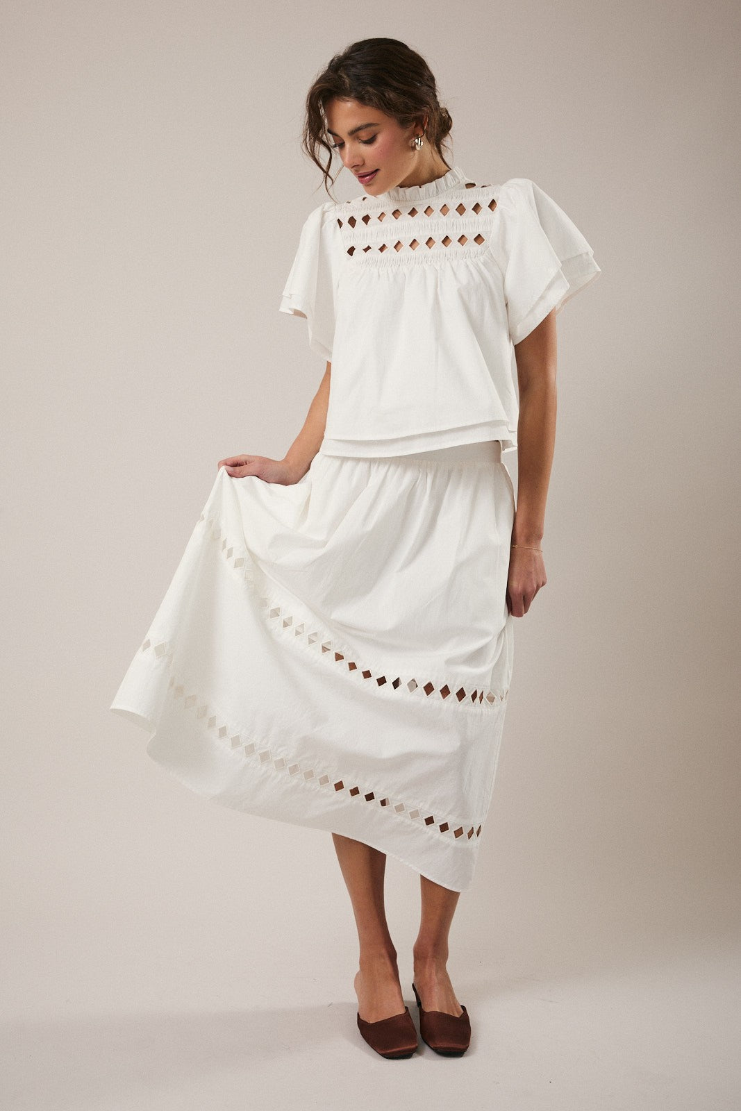 Effortlessly romantic and fresh, the Paloma Eyelet Set is your go-to outfit for sun-drenched days and casual getaways. This two-piece cotton ensemble features a relaxed flutter-sleeve top with intricate diamond eyelet detailing across the chest, paired with a breezy high-waisted midi skirt that mirrors the same cutout pattern. Lightweight, breathable, and easy to style, this set brings charm and comfort in equal measure. Wear it with sandals or espadrilles for a laid-back summer vibe.