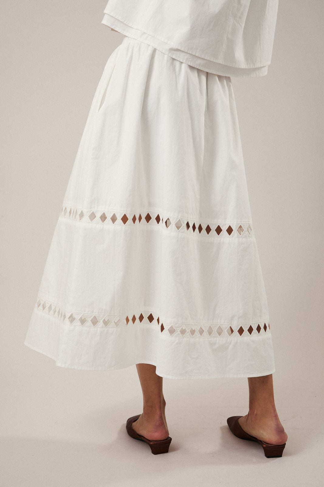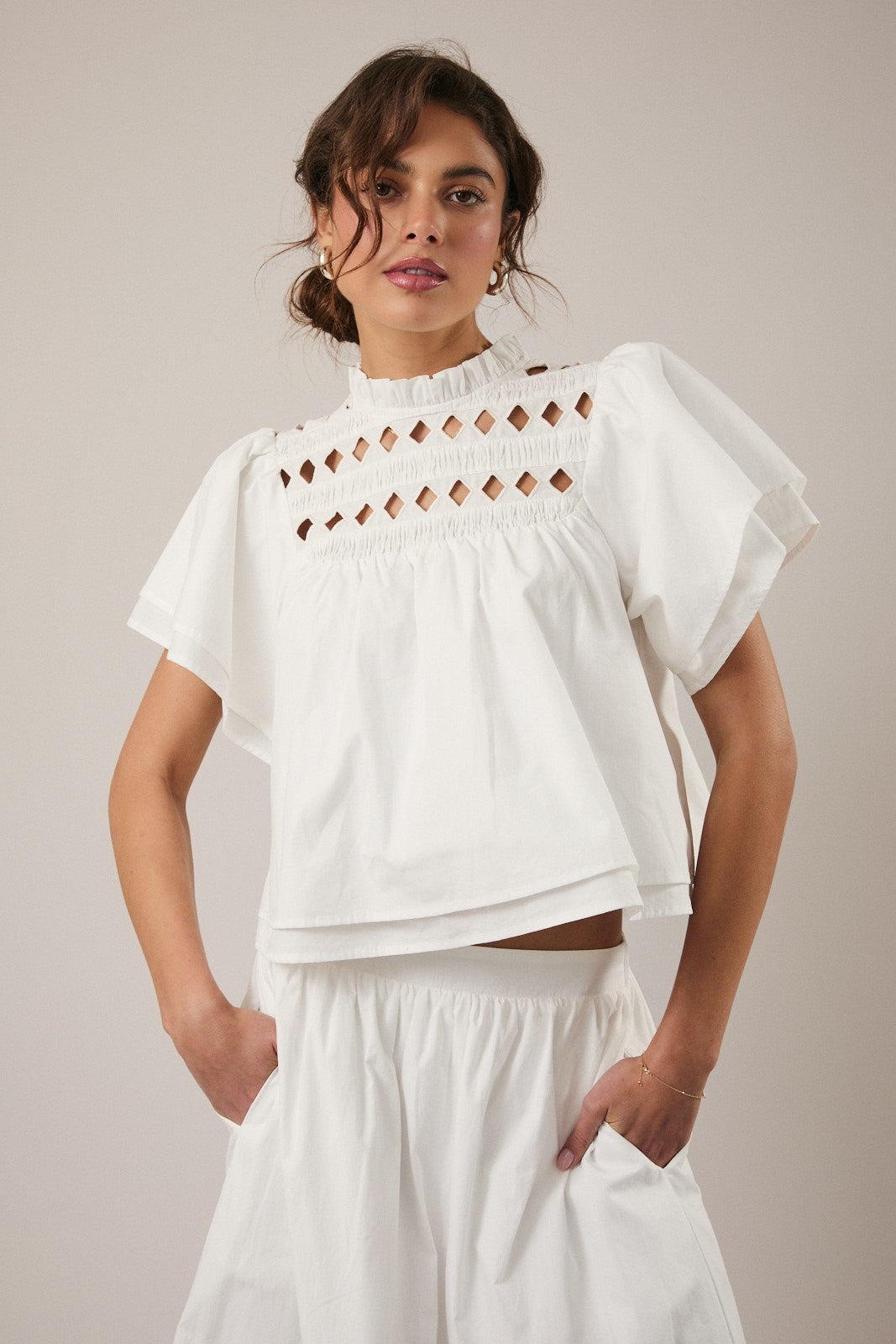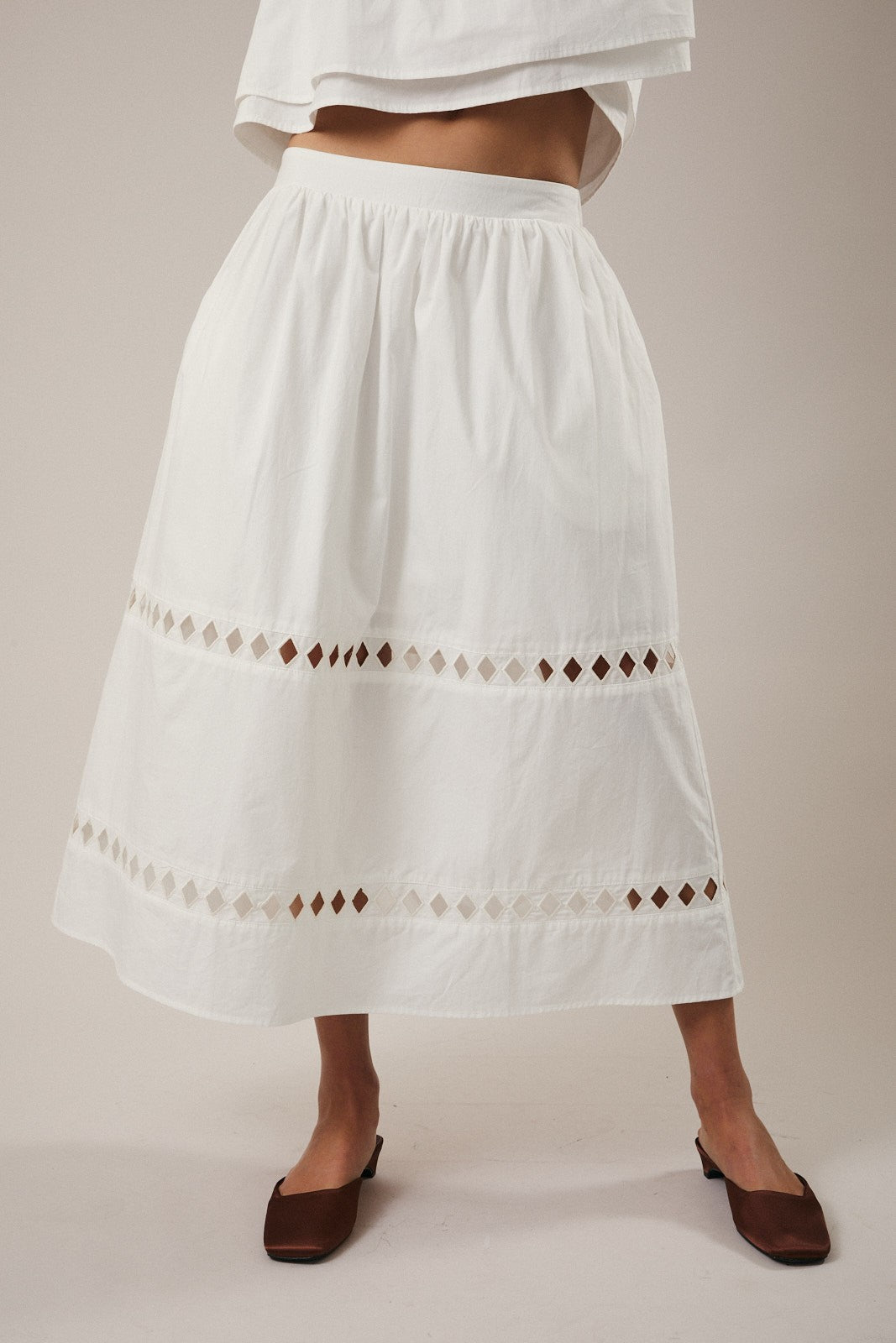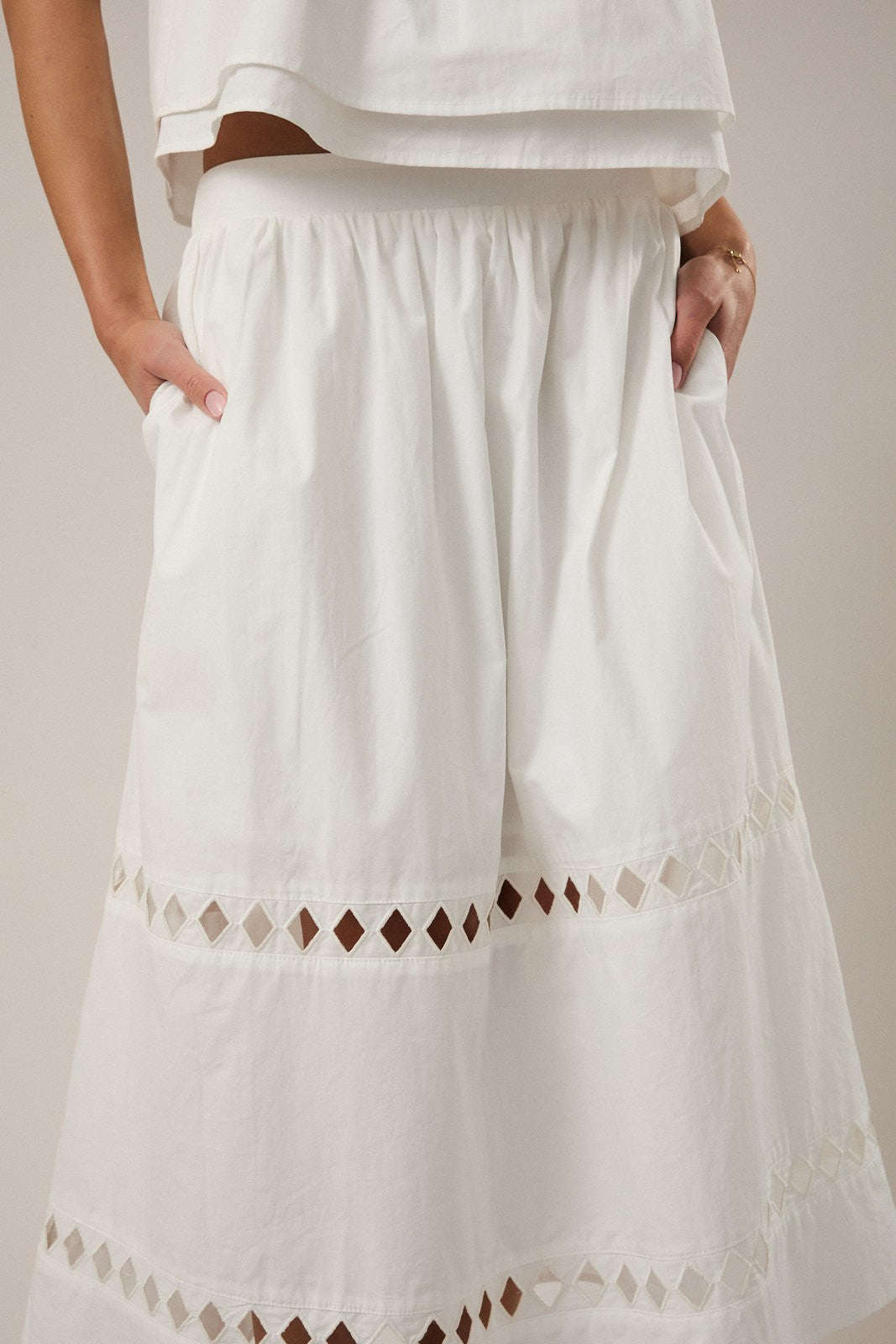 Effortlessly romantic and fresh, the Paloma Eyelet Set is your go-to outfit for sun-drenched days and casual getaways. This two-piece cotton ensemble features a relaxed flutter-sleeve top with intricate diamond eyelet detailing across the chest, paired with a breezy high-waisted midi skirt that mirrors the same cutout pattern. Lightweight, breathable, and easy to style, this set brings charm and comfort in equal measure. Wear it with sandals or espadrilles for a laid-back summer vibe.