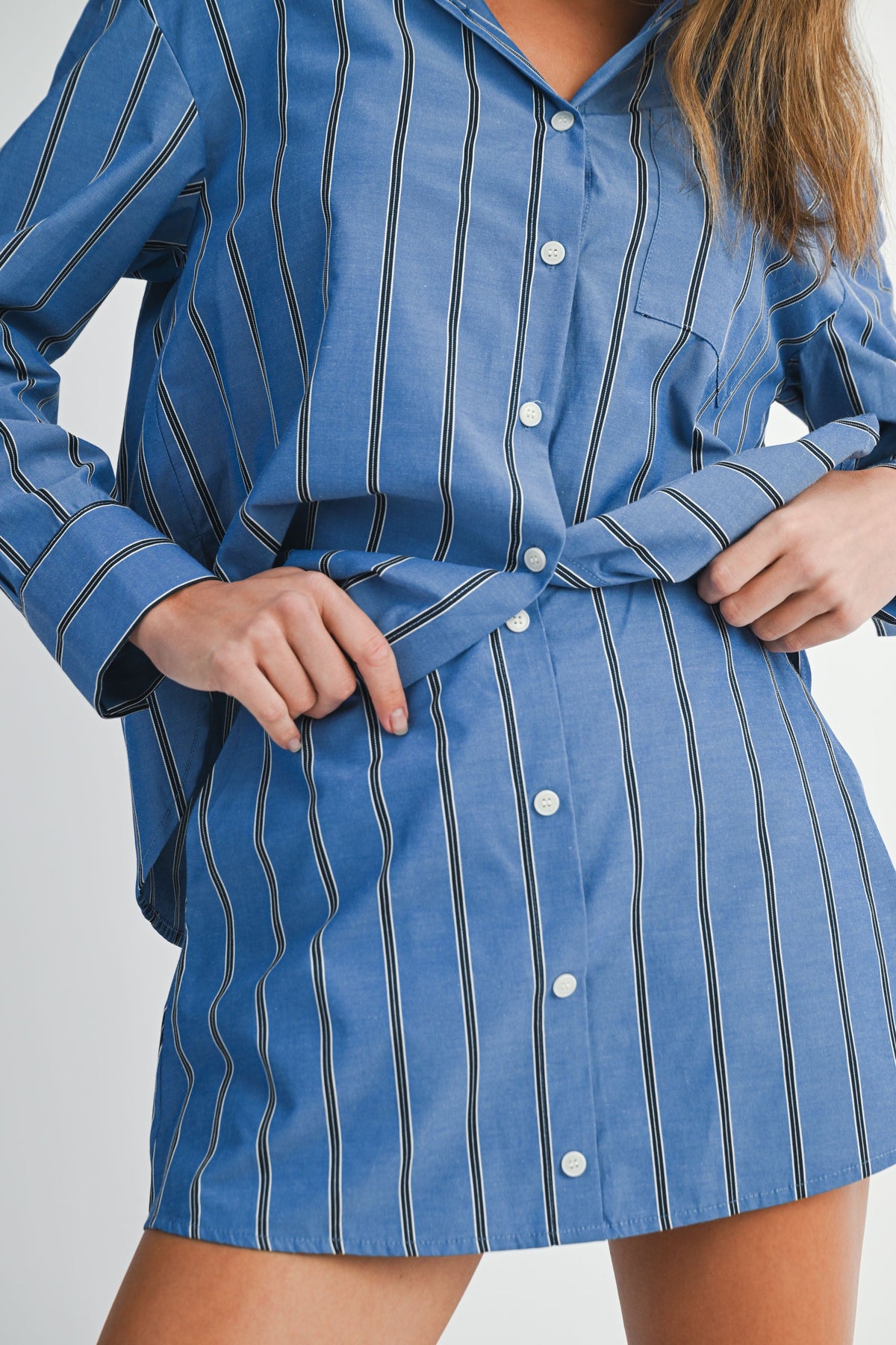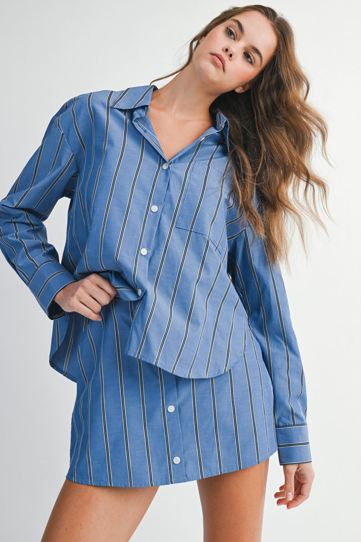 Effortlessly cool with a borrowed-from-the-boys twist, The Porto Set is your new go-to for elevated everyday dressing. Designed in a bold blue stripe with contrast piping, this matching set features a relaxed button-down top and a matching skort that gives the illusion of a shirt layered over a mini. It's playful, polished, and perfect for that “I didn’t try too hard, but still look put together” vibe.
